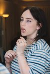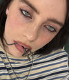 Billie backstage in Tokyo on her HIT ME HARD AND SOFT Tour, wearing the Icon 50 Cross Pendant in Dark Silver.