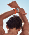 Heishi arrives in our trademark colorway—a vibrant mix of hand-cut orange oyster shells and painted enamel beads, strung by hand.