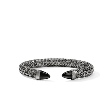This archive-inspired flex cuff features our iconic carved chain motif, culminating in polished hardstone tips. Artisan handcrafted in reclaimed dark silver and ethically sourced black onyx.