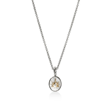 Artisan handcrafted in reclaimed sterling silver, featuring a hand-carved sun motif in reclaimed gold—a symbol of new beginnings.