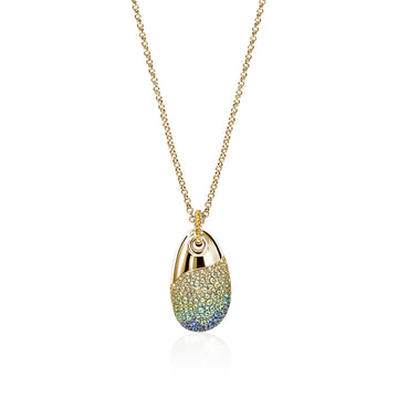 A pinnacle edition of our Pebble Pendant, this piece was handcrafted by our team of Master Artisans in reclaimed 18K yellow gold encrusted with an ombre pavé of yellow sapphires, peridots, tsavorites, emeralds, paraiba tourmalines, green and blue sapphires. Inspired by the natural beauty of treasures found on the beach.